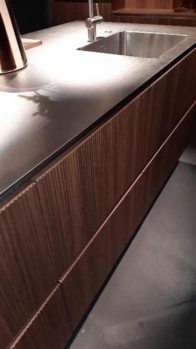 Lors de l’un de mes derniers voyages en Italie et en Allemagne chez différents fabricants, j’ai pu redécouvrir des cuisines équipées avec des placards en bois. Attention cependant, si les cuisines en bois massif existent encore, on parle ici de bois plaqué. Avec l’avantage que le plaqué bois offre des stries sur la hauteur et une profondeur inégalable à votre cuisine équipée sur mesure.