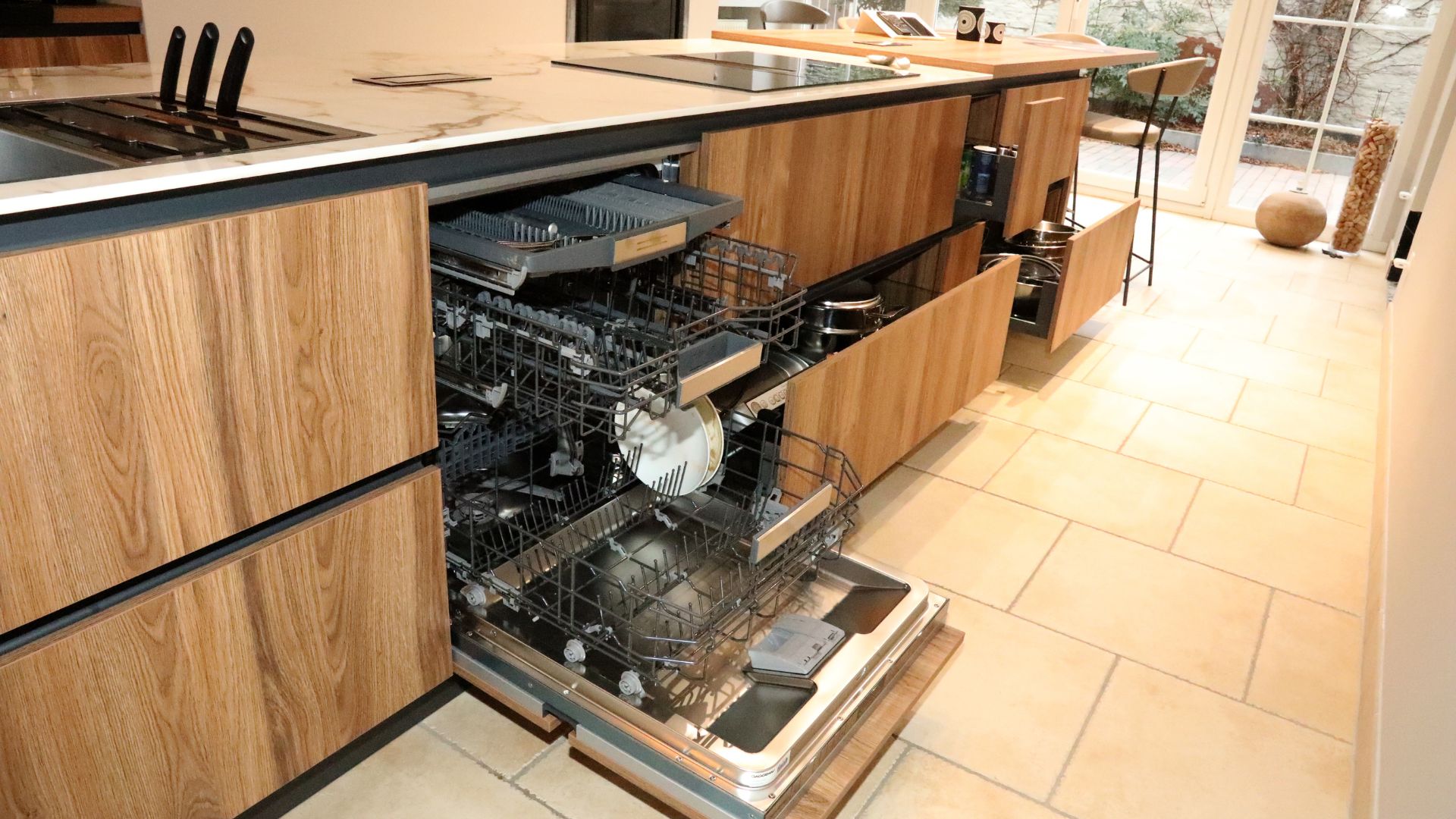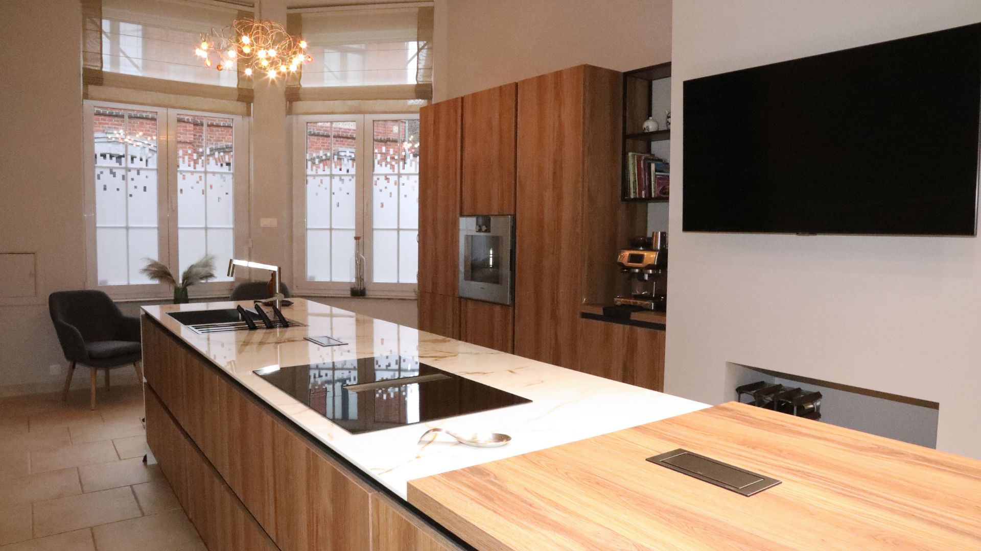 Découvrez cette très belle réalisation de cuisine avec des façades en bois et un Fénix noir et tous ses équipements près de Mettet