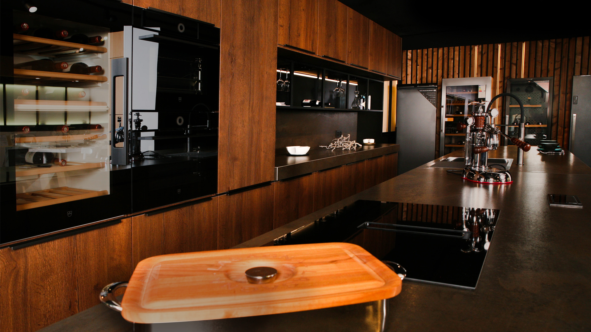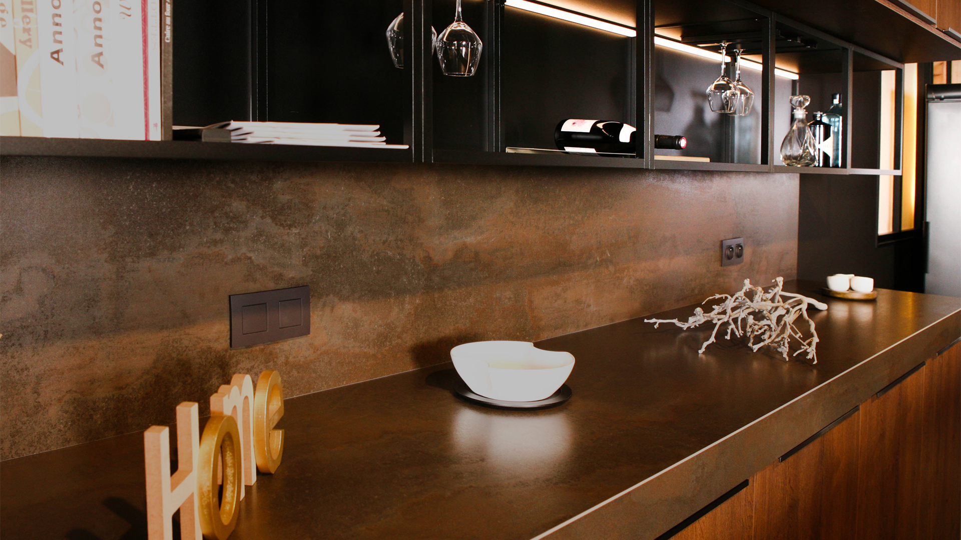 Un mélange de céramique, de bois brut et foncé, des électroménagers à la pointe de la technologie et des étagères lumineuses lui confèrent un look unique et magistral.