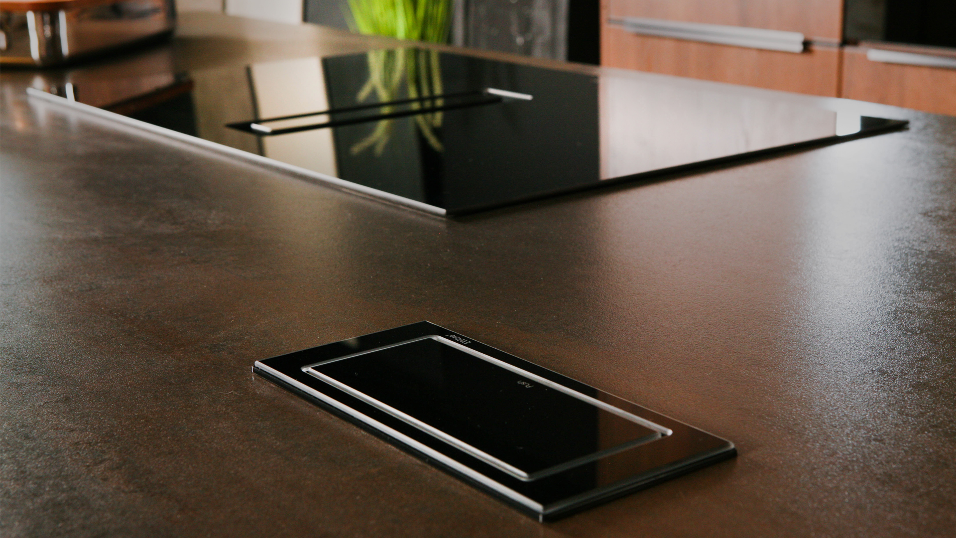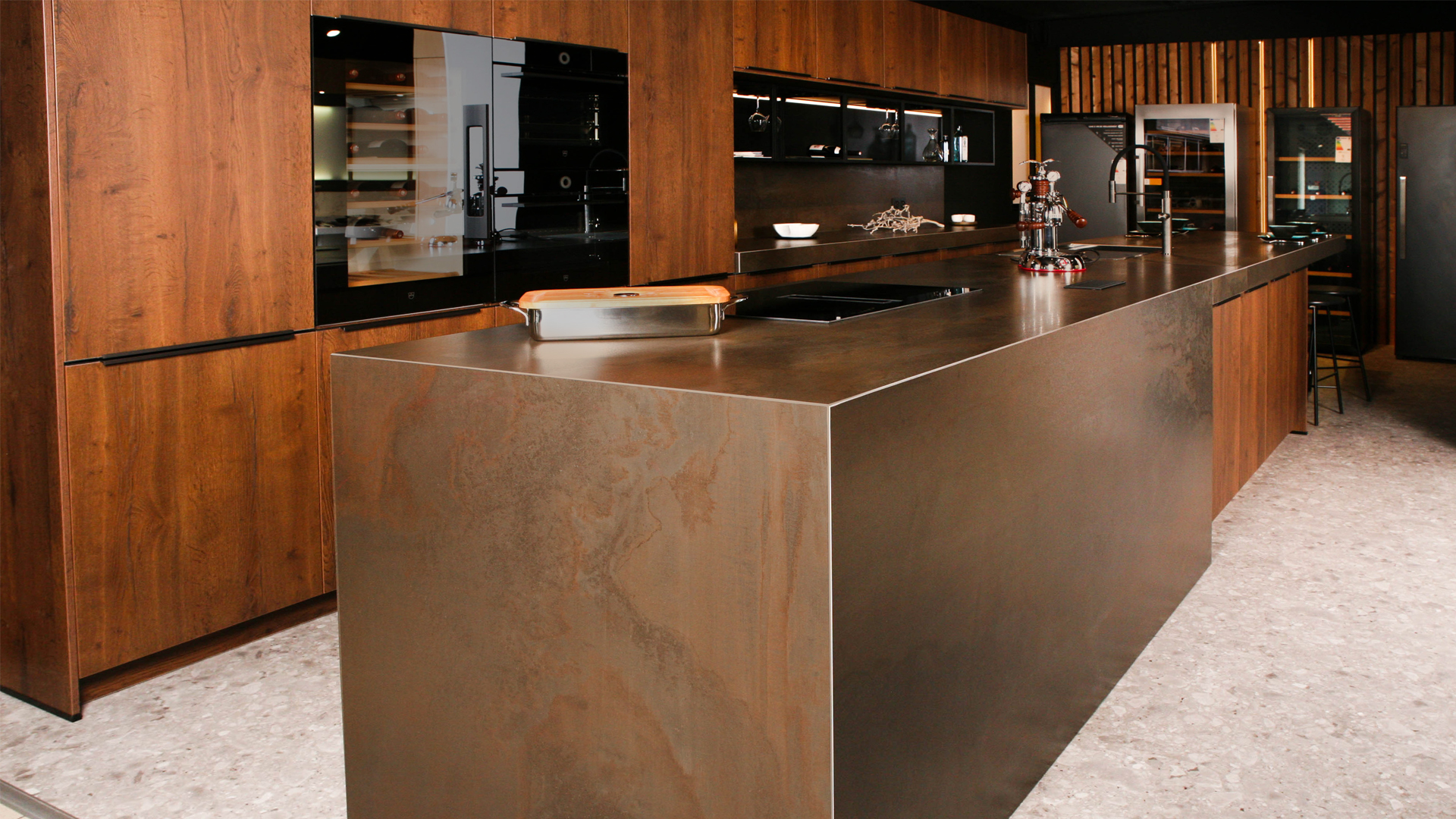 Cette nouvelle cuisine d'exposition est surprenante, chaleureuse et bien-sûr, ergonomique. Laissez-vous saisir par le toucher du plan de travail