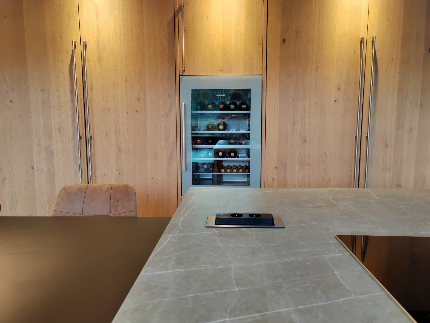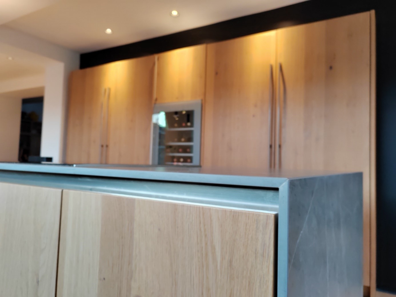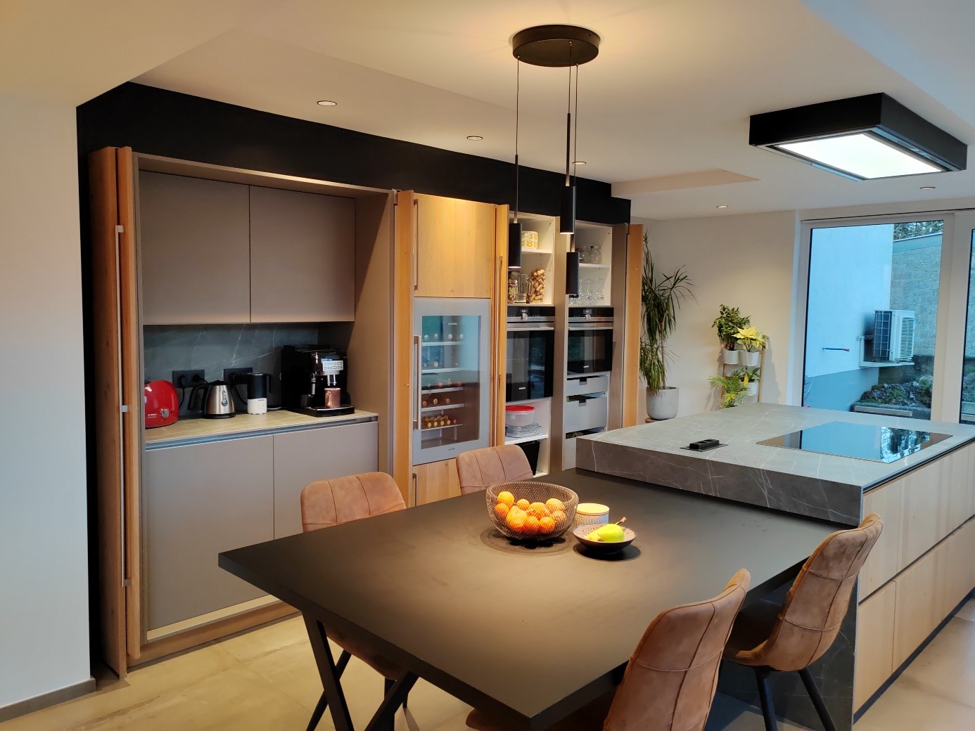 Découvrez cette très belle réalisation de cuisine avec des façades en bois et un Fénix noir et tous ses équipements près de Mettet