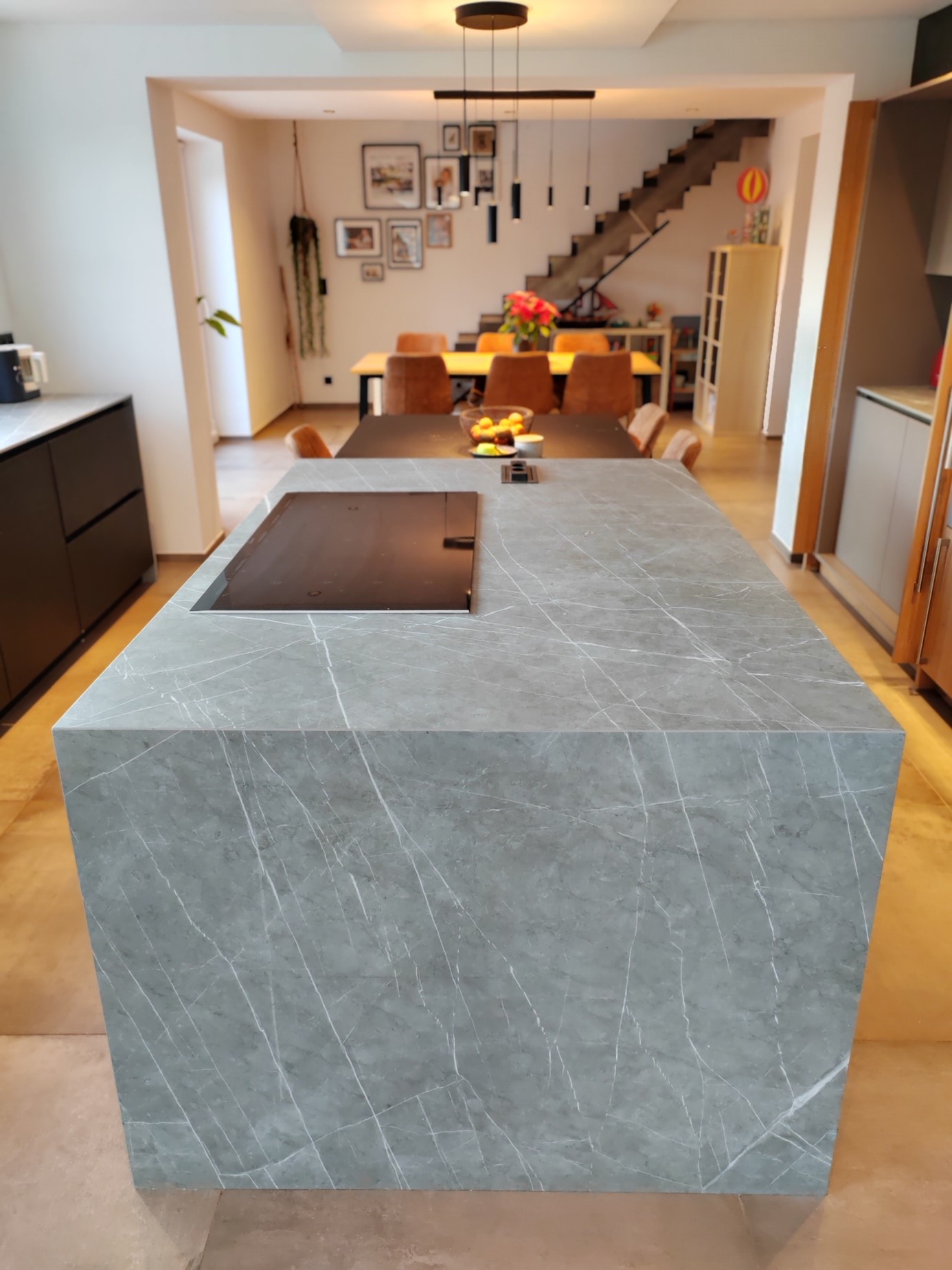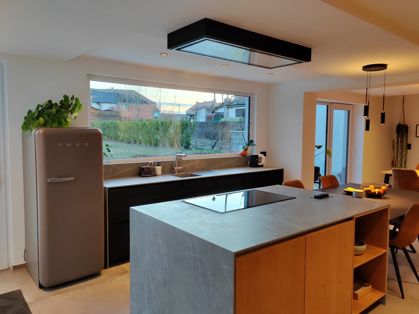 Découvrez cette très belle réalisation de cuisine avec des façades en bois foncé et un plan de travail en céramique effet marbre dans le Namurois