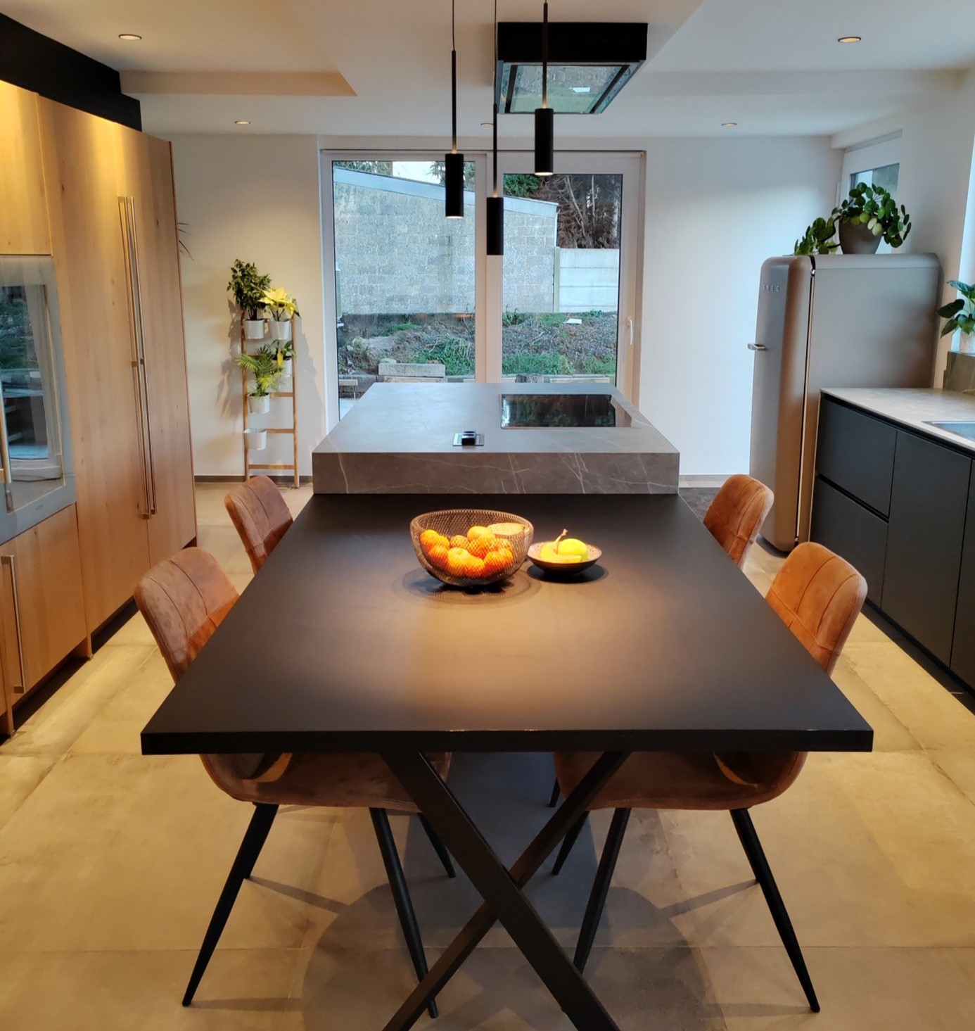 Découvrez cette très belle réalisation de cuisine avec des façades noir mat et un plan de travail en céramique imitatant la pierre