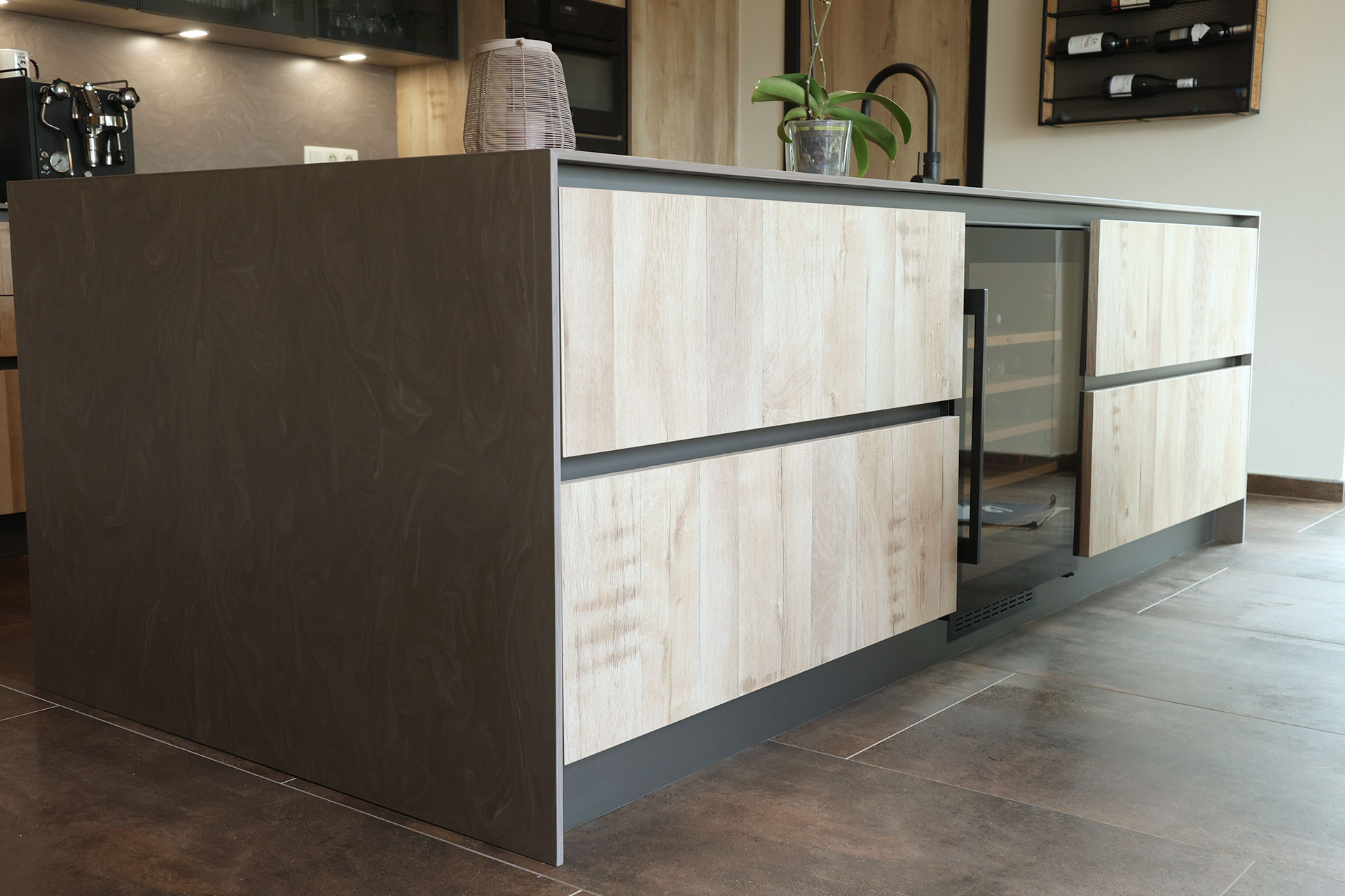 Découvrez le doux mélange de couleur entre l’anthracite mat des portes en stratifié, le bois et le somptueux DEKTON du plan de travail