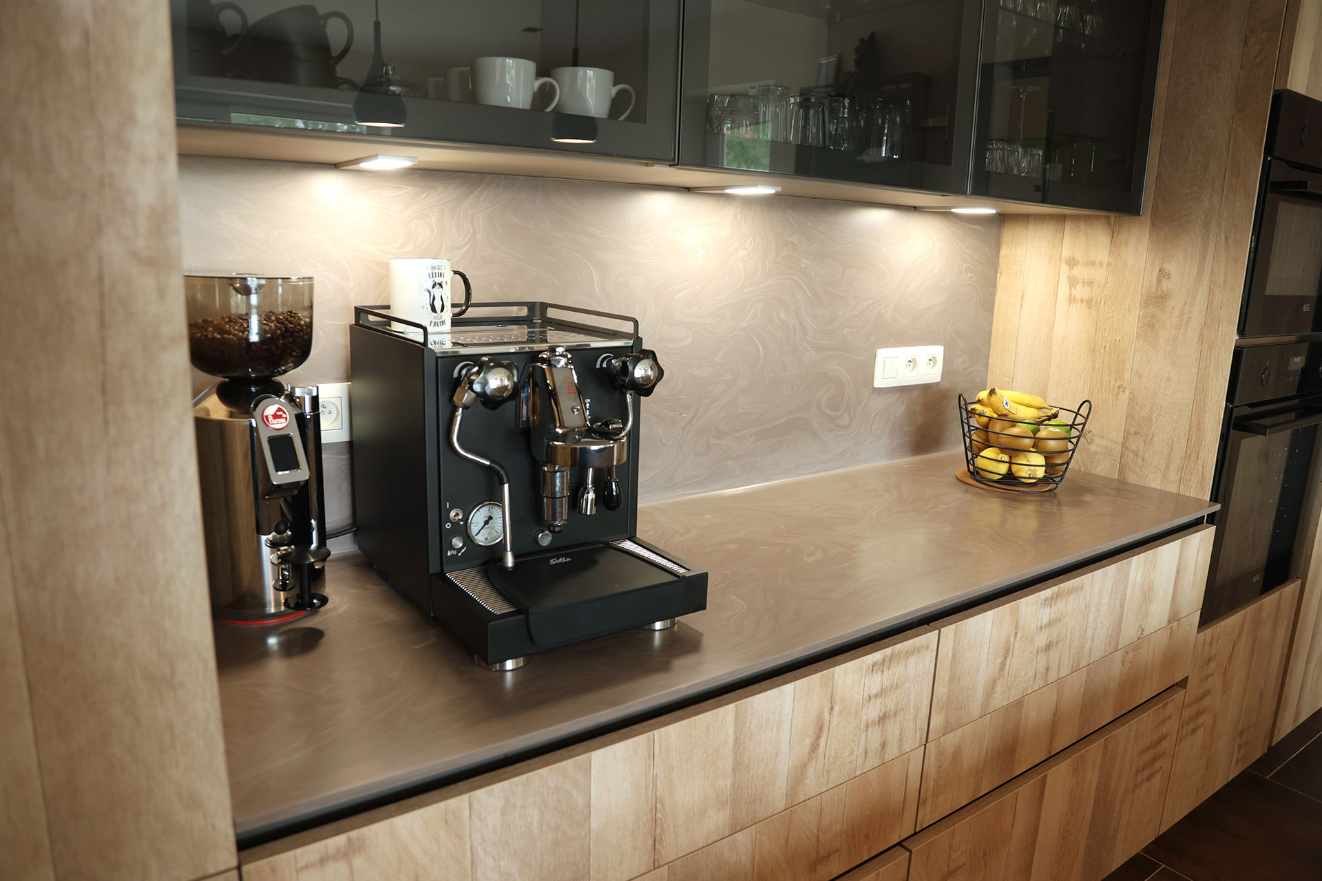 Découvrez cette très belle réalisation de cuisine équipée avec un plan de travail et une crédence murale en Mortex