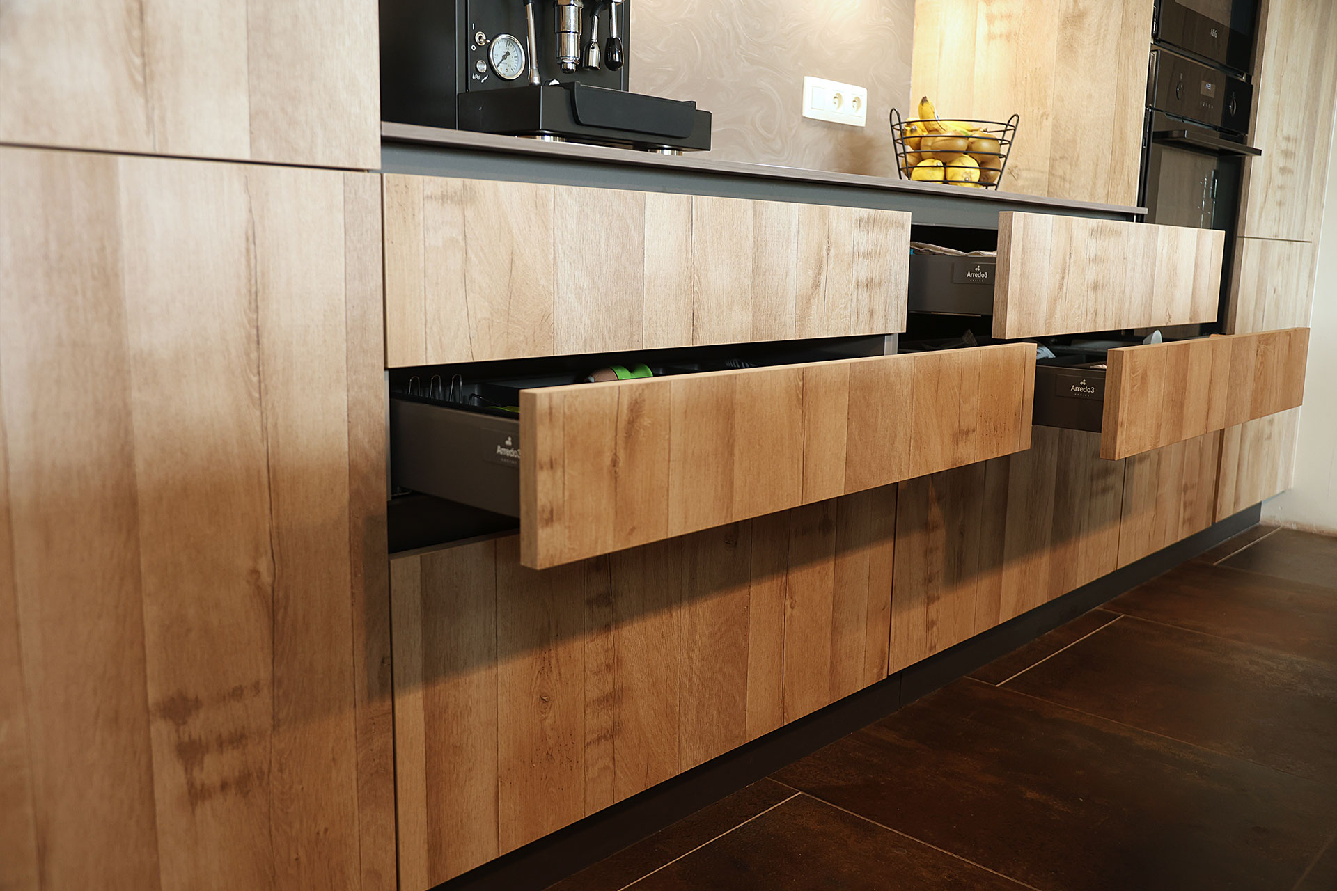 Découvrez cette très belle réalisation de cuisine avec des façades en bois et un Fénix noir et tous ses équipements près de Mettet