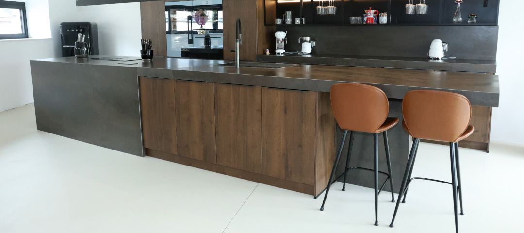 Découvrez le doux mélange de couleur entre l’anthracite mat des portes en stratifié, le bois et le somptueux DEKTON du plan de travail