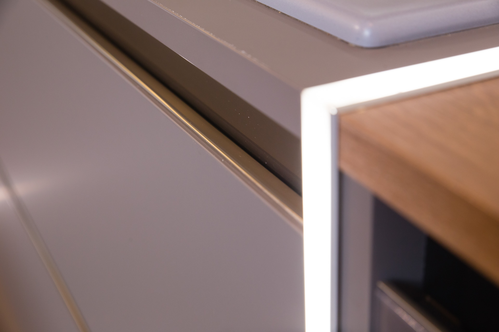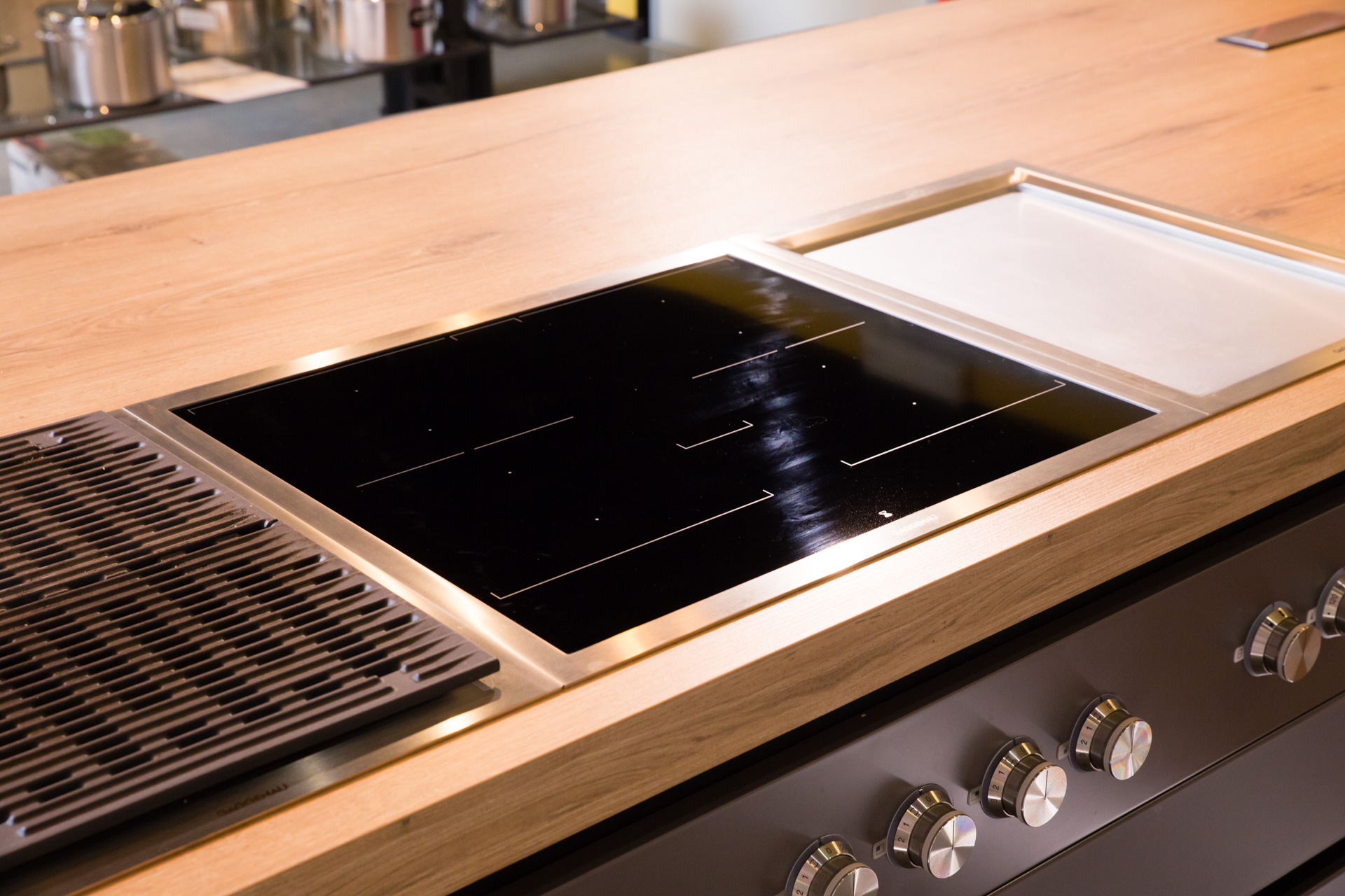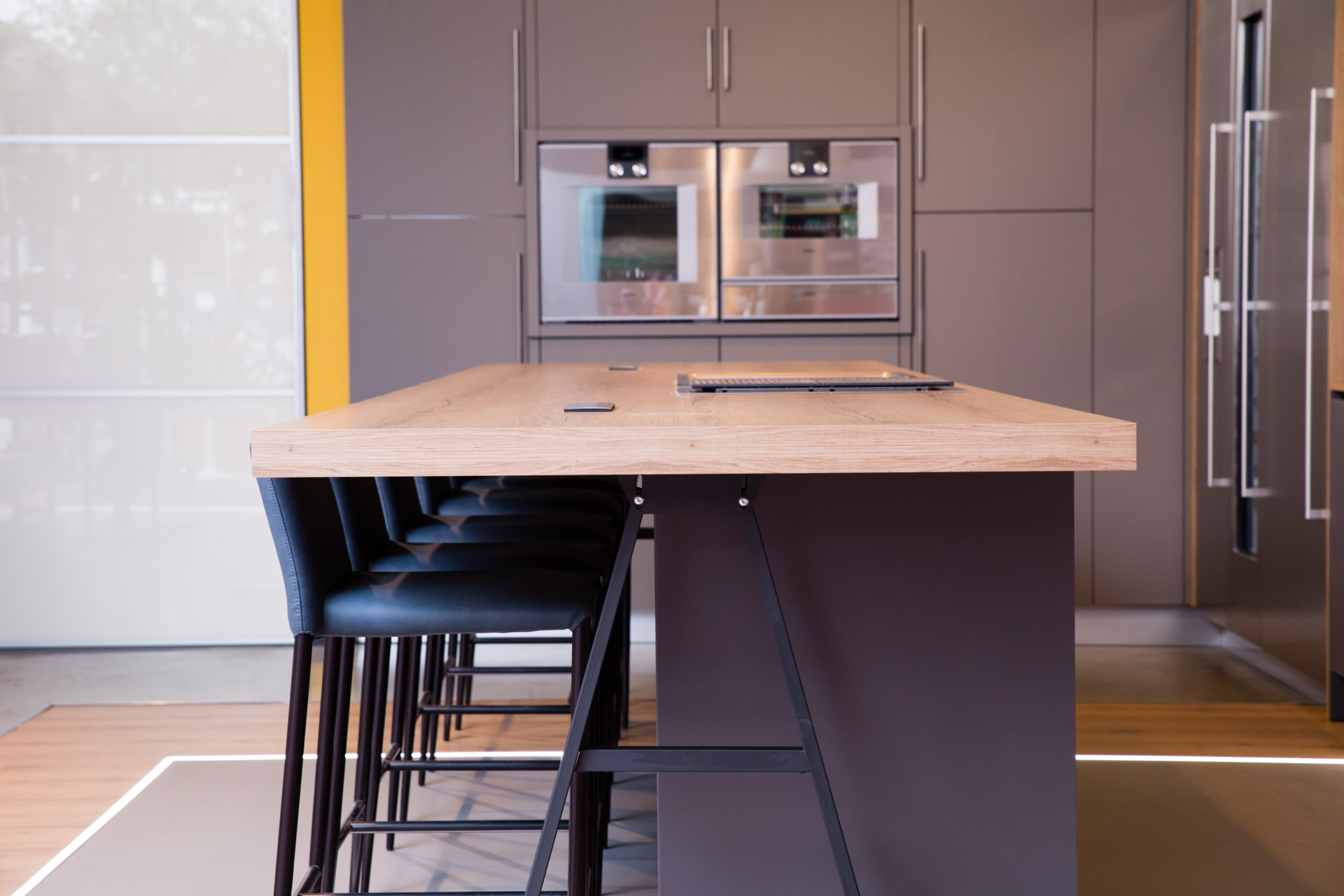 Cette nouvelle cuisine d'exposition est surprenante, chaleureuse et bien-sûr, ergonomique. Laissez-vous saisir par le toucher du plan de travail
