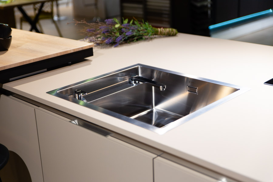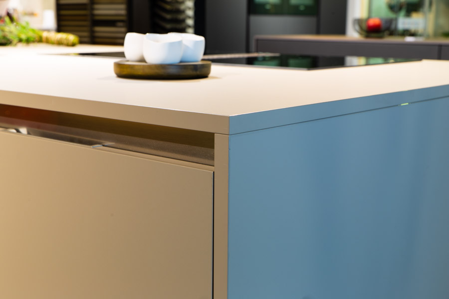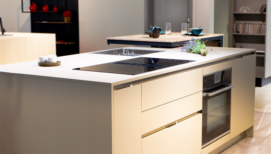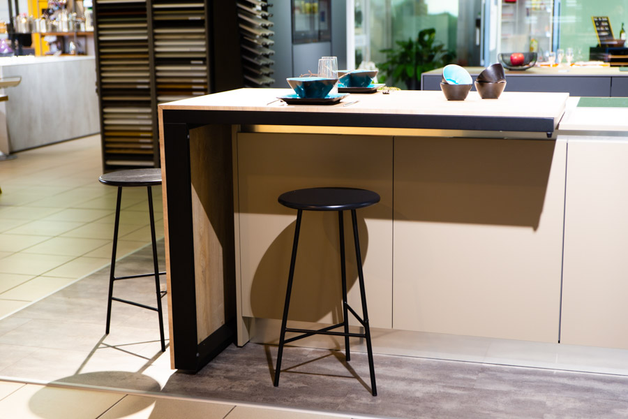 Cette nouvelle cuisine d'exposition est surprenante, chaleureuse et bien-sûr, ergonomique. Laissez-vous saisir par le toucher du plan de travail