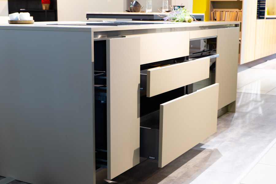 Découvrez notre cuisine de démonstration avant-gardiste qui mélange une modernité aussi bien au niveau couleur, rangements et électroménagers