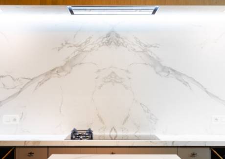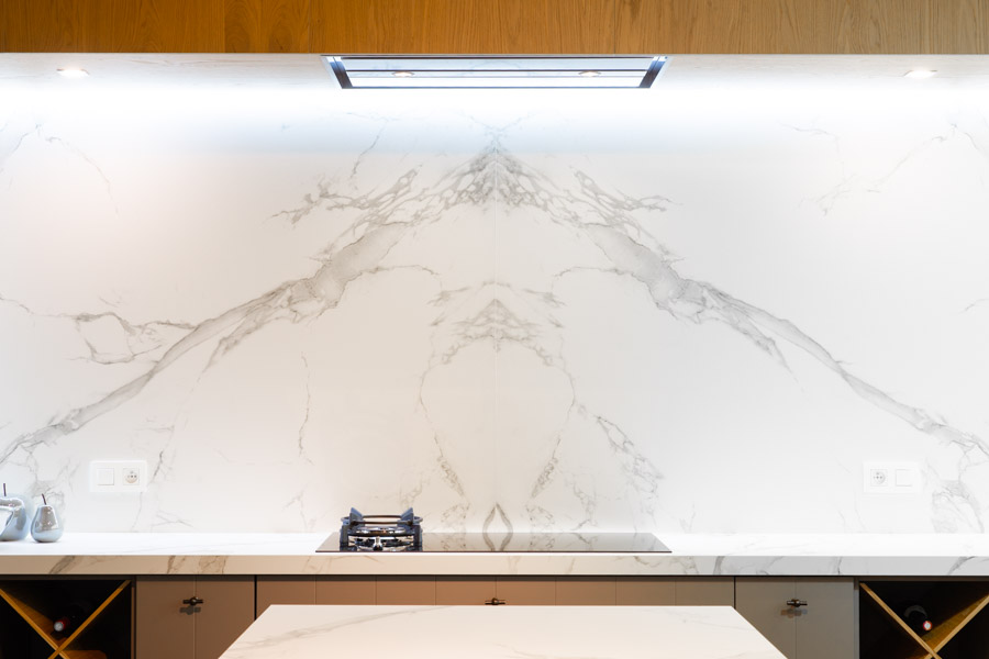 Crédence murale | Crédence en Dekton Calacatta montée en livre-ouvert |