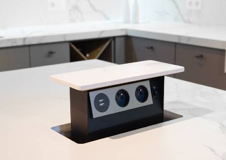 Cette nouvelle cuisine d'exposition est surprenante, chaleureuse et bien-sûr, ergonomique. Laissez-vous saisir par le toucher du plan de travail